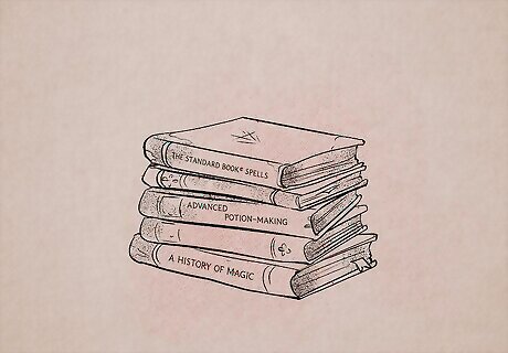 Stack of books for Hogwarts Channel your inner Hermione with a design featuring a stack of textbooks for the upcoming year at Hogwarts! For some extra attention to detail, be sure to include real names of textbooks from the series, such as The Standard Book of Spells by Miranda Goshawk, Advanced Potion-Making by Libatius Borage, and A History of Magic by Bathilda Bagshot. If you want to make this design a bit bigger or more elaborate, consider including Hedwig in his cage or the Sorting Hat on top of the stack of books!