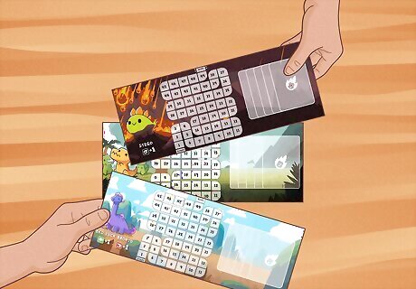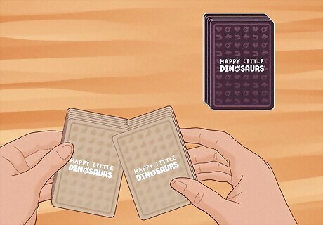 Separate the light and dark cards, and shuffle them separately. Happy Little Dinosaurs features 2 main card types: light and dark. These are also known as the Main Deck and Disaster Deck, respectively. Shuffle both decks and place them face down in the center of the table, where every player can reach them.