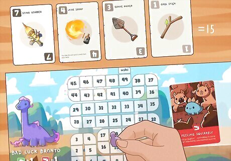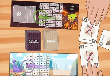 Move your dino forward according to your points and disaster cards. The player who played the highest point card and collected other players’ point cards adds up the points on each card played that round. Then, they move their dinosaur forward that number of spaces. In addition, every player moves their dino forward the same number of spaces as the number of disaster cards they have on their board. For example, if you won the round with a point card of 7, you’d take the other players' cards and add them to your 7 (e.g. 7+4+3+1=15), then move that number of spaces on your dino board. Then, every player checks how many disaster cards are on their board and also moves that number of spaces. If you have 3 disaster cards, for example, you’ll automatically move 3 spaces every round.