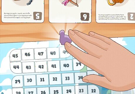Collect all the played point cards if you played the most points. In general, the name of the game is to play the highest point card. If, when everyone reveals their point cards, you have the highest card, you collect all the played point cards for that round. You’ve won the round, but you haven’t quite won the game just yet!