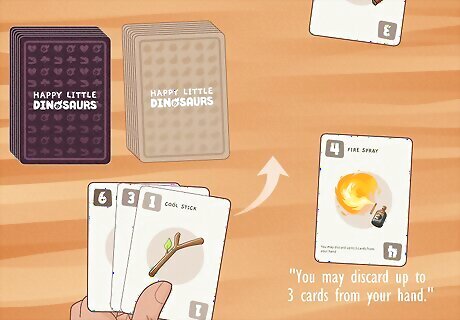 Play a point card from your hand at the same time as everyone else. There are no turns in Happy Little Dinosaurs. Everyone plays at the same time! Choose a point card from your hand to play. Then, count down from 3: “3, 2, 1, Go!” On “go,” everyone flips over their chosen card, revealing it to the other players. Point cards are light cards with numbers in their corners. Generally, the best strategy is to try to play the card with the highest number, but not always! Some point cards have bonus effects that activate when you play them. We’ll talk about those effects in the next section. Players shouldn’t play Instant Cards at this point. Instant cards have no numbers in their corners, and can only be played when the card says it can be played. If a player has no point cards to play, they discard their hand and draw 5 more cards, repeating until they have at least 1 point card.