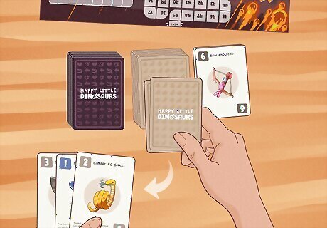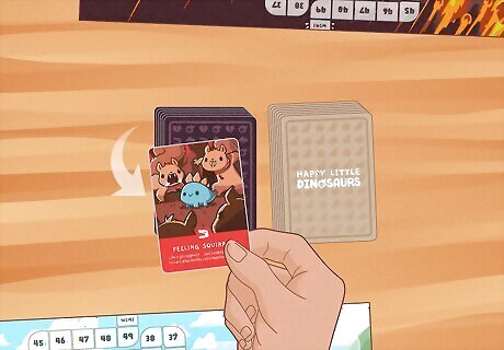 Start a new round by drawing cards until you have 5. Once everyone has played their hands, counted their points, and moved their dinos forward on their boards, a new round begins. Discard all the played point cards into a face-up pile. Then, each player with fewer than 5 cards draws more until they have 5 cards. Finally, the round begins again, and players choose point cards to play.