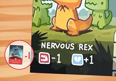 Lose the game if you collect 3 disaster cards of the same color, or of each color. While disaster cards can move you further up, they can also spell certain doom for your dino. If you collect 3 disaster cards of the same color, you’re immediately eliminated from the game and must sit out for the rest of it. Same goes for if you collect 1 disaster card of each color. Meteor cards (black) count as disaster wildcards. In other words, they count as a disaster of every color. So if you collect 2 red disasters plus a meteor, you’re out! You’re also eliminated if you collect 2 other disasters of any color while you have a meteor card in your disaster pile. That means that 1 red card plus 1 blue card plus 1 meteor will still eliminate you.