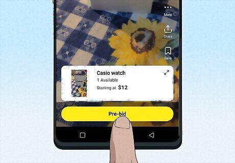 Swipe at the bottom of the screen to place a bid. Most Whatnot sellers sell their items via auction. When an auction is live, you'll see the current bid at the bottom of the screen. Simply swipe the yellow bar to place your bid. If your bid is the highest when the auction ends, you'll win the item. Most auctions only last for a few seconds, and many bidders usually wait for the last few moments of the auction to place their bid. If you don't want to purchase during a livestream, you can also access a Whatnot seller's shop and buy from there.