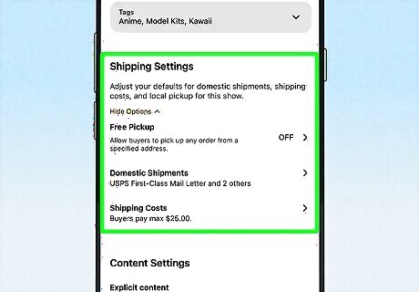 Set up your shipping settings. From your Seller Hub, set up your shipping settings before you schedule your first show. You can adjust whether you offer free item pickup for local buyers, what domestic shipping options you offer, who will pay for shipping, and any custom shipping profiles for specific items.
