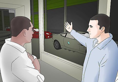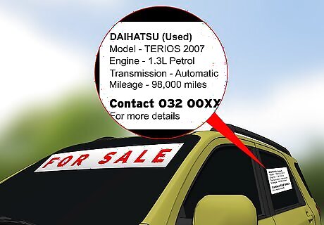 Write "for sale" on your car with window paint. If you already have another vehicle, park your car off to the side of a main road with "for sale" written in big letters on the windshield. Then, on the other windows, write more details about the car, like the asking price, mileage, and year. If you don’t have another car yet, simply write the same information on one or two side windows and continue to drive it around. After you finish the sign, take a good number of steps back and look at it. Make sure that other people could read it from afar.