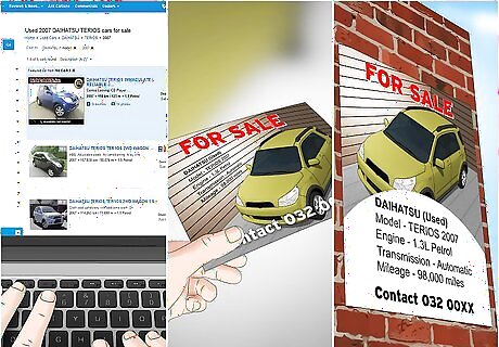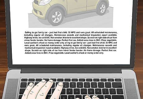 Advertise in a minimum of three places. To bring in the most potential buyers, select three spots to place your ad. You could go all online or do a combination of websites and in-person methods, such as flyers. Make sure that you post the same information to all of these places to avoid any confusion. Be sure to update all of your postings and flyers if you choose to change your selling terms, such as lowering your asking price.