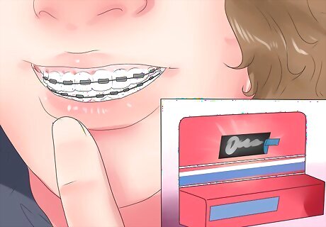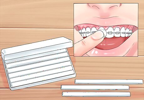 Apply orthodontic wax to your mouth. Orthodontic or dental wax is used as a barrier between your braces and the inside of your mouth. It is readily available at drug stores; your orthodontist may have given you some when you got your braces. To apply the wax, break off a small piece of wax and roll it into a little ball about the size of a pea to warm it up and make it easier to apply. Use a piece of tissue or cotton to dry the area of your braces where you would like to apply the wax, and press it directly onto the wire or bracket. Repeat as often as necessary.