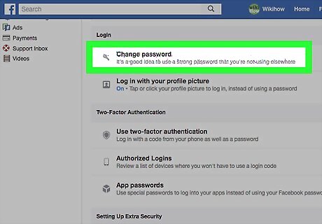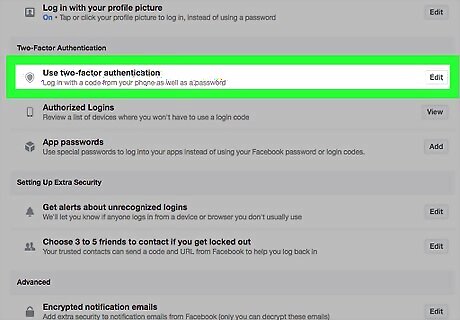 Enable two-factor authentication. Two-factor authentication is a service which requires two methods of verification—a password and a unique code that is sent to your phone—to log into Facebook. This means that anyone attempting to break into your Facebook account will need both your Facebook password and your phone in their hand to succeed. To enable two-factor authentication, do the following: Go to https://www.facebook.com and log in. Click the "Menu" icon Android 7 Dropdown in the upper-right corner. Click Settings Click Security and Login Scroll down to the "Two-Factor Authentication" section. Click Edit to the right of "Use two-factor authentication", then click Get Started. Enter your password when prompted. Check the "Text Message" box, then click Next (you may have to enter your phone number before proceeding). Enter the six-digit code that Facebook texts to your phone number, then click Next. Click Finish when prompted.