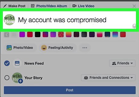 Alert your friends that your account was compromised. A side effect of most Facebook hacks is that your friends may receive a message with a malicious link from your account. In order to prevent the hack from propagating on Facebook, post a status alerting your friends that your account was hacked. You might want to explain briefly the circumstances under which your account was compromised (for example, if you were hacked when you opened a message from someone, mention that in your post) to help your friends know what to look for.