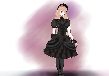 Know how to build a Lolita outfit. A Gothic Lolita look has many parts you can vary or alter as you like, but there are a few basic rules. One of them is that Gothic Lolitas favor dark colors, with the exception of white or cream accents - you probably won't find one wearing pink or other bright colors prominently. Here's what else you need to know, arranged in the order in which you'd get dressed. Start with undergarments. The most identifiable part of a Lolita look is the bell-shaped skirt that falls two inches above the kneecap or lower. Buying a petticoat, or pannier, built specifically to fill out Lolita skirts is essential. In order to maintain modesty in case the petticoat blows up in the breeze, Lolitas wear bloomers underneath the petticoat and over their regular underwear. Gothic Lolitas can also wear a corset, provided it's laced or buttoned properly. (Wearing a corset or bustier alone as a top falls into the Ero Lolita category.) Bloomers and petticoats should never be readily visible in the finished look.Be a Gothic Lolita Step 3Bullet1.jpg Wear a refined, well-made blouse. Gothic Lolita blouses often feature fine tailoring, such as pintucks, embroidered details, and embellished cuffs or necklines. A slim, close fit is ideal; the blouse should never be baggy or saggy.Be a Gothic Lolita Step 3Bullet2.jpg Put on an embellished skirt, JSK, or one-piece dress. Gothic Lolita skirts commonly include ruffles, elegant patterns or bustles. They should sit at the natural waist and no lower, as well as almost covering your knees when standing. A JSK, or jumper skirt, is one you "jump" into, applied from the feet up. It usually includes some part that will cover part of the blouse. A black JSK over a white blouse is a typical Gothic Lolita look. For fancy events, Gothic Lolitas will sometimes wear one-piece dresses without a blouse. These garments are designed to fit closely through the torso and flare appropriately to accommodate the petticoat.Be a Gothic Lolita Step 3Bullet3.jpg Wear modest stockings or tights. Some Lolitas wear socks or tights that hit below the kneecap, but Gothic Lolitas tend to prefer those that go over the knee. Wear garters under your bloomers to hold them up, if necessary. In general, Gothic Lolitas eschew sheer nylon or tights, favoring an opaque look instead.Be a Gothic Lolita Step 3Bullet4.jpg Choose dark shoes. Lolita style overall usually demands Mary Jane shoes, with perhaps a "Lolita heel" at the back. For Gothic Lolita, your shoes should be black or otherwise dark. If you choose to wear boots or another embellishment on Mary Janes, make sure they keep to a slim, natural leg silhouette - chunky combat boots would be out of place on a Gothic Lolita.Be a Gothic Lolita Step 3Bullet5.jpg Use hair accessories. An iconic Gothic Lolita accessory is a dark, large Alice bow, modeled after that of the heroine of Alice in Wonderland. You can also wear embellished headbands, combs or clips, as well as fascinators, period-appropriate hats or tiny top hats.Be a Gothic Lolita Step 3Bullet6.jpg Find a jacket. During colder months, Gothic Lolitas bundle up in well-tailored jackets. Choose black or another dark color, such as burgundy, navy, dark purple or hunter green.Be a Gothic Lolita Step 3Bullet7.jpg Finish up with other accessories. Some Gothic Lolitas carry parasols to shield themselves from the sun; others wear jewelry focused on elaborate crosses or carry purses in the shape of a coffin. Be creative with your accessories to make the Gothic Lolita look uniquely yours.Be a Gothic Lolita Step 3Bullet8.jpg