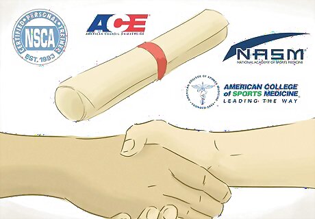 Choose a certification that meets the requirements of your desired career. Different types of careers need different types of certifications. Here are some examples of certifications and the sort of work associated with them: American Council on Exercise (ACE) certifications are useful if you want to educate people on fitness and teach them how to eventually perform the exercises on their own. American College of Sports Medicine (ACSM) certifications are useful if you want to work with people who are recovering from illness or an injury and need to improve their strength and mobility. National Academy of Sports Medicine (NASM) certifications are useful if you want work with people who wish to improve their strength and fitness. Clients are usually athletes, both student and professional. National Strength and Conditioning Association (NSCA) certifications are useful if you want to help people improve their strength and mobility. These people can be healthy individuals or those recovering from an illness or an injury.