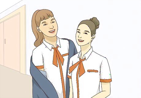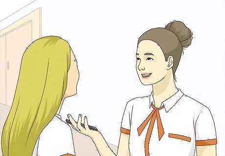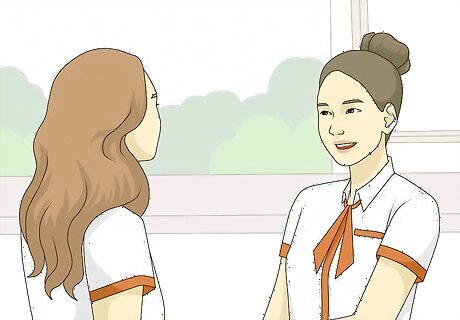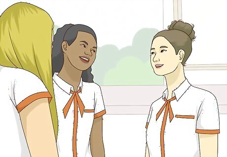 Make conversation. In many wikiHow articles, people suggest making small talk and using ice-breakers like "It looks like it is going to rain" or "What class do you have next?" Don't do that! Your conversations will run dry in seconds if you start with a topic like that. Turn to a group of girls and ask, "Does anyone have Honors English 1 next hour?". That way, you will give off a confident impression and also find someone to sit next to in the first hour! Talk to the girl that's going to be in your class and ask her what things she likes. Girls come from all over to go to private schools, so if you haven't heard of that thing before, ask her what that is. This will lead to a longer conversation, and maybe even a friendship!