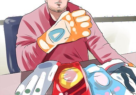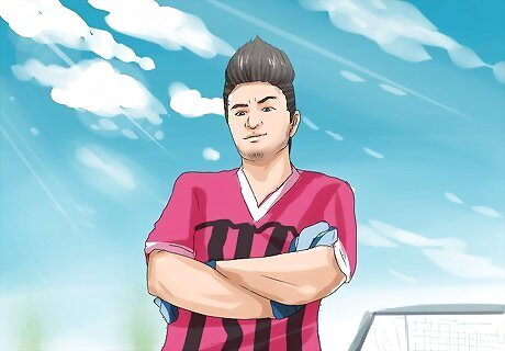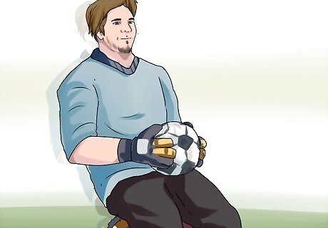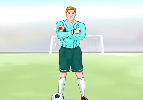 Get the proper equipment to be a goalie. Before you start playing and training as a goalie, purchase the proper equipment. From gloves to cleats and shin guards, each piece of equipment will ensure that you are prepared to play your best and safest. You need the following equipment to play: goalkeeper gloves, cleats/football/soccer boots, shin guards/shinpads, socks, and a jersey. Goalie gloves, which are made of thick leather, cushion your hands when you catch or stop shots on goal. They also help you grip the ball better. Cleats/Soccer boots are special sneakers for soccer. They have hard stud on the bottom of the shoe that allows you to grip the turf on the field more effectively. Shin guards protect your lower leg bones from being kicked by the hard cleats, which can be not only painful, but also injure you. You must wear socks that cover your shin guards completely, which also helps keep them in place. A goalie jersey may have padding in the shoulder and hip areas to protect you from the force of direct shots on goal. If you play for a team, it will often provide you with a proper goalie jersey for your team. You can purchase all of the necessary soccer equipment at specialty sports stores or even at an online retailer such as Soccerpro.com or Footy.com.