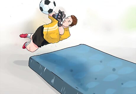 Learn how to anticipate opposing players’ moves. One of the primary jobs of a goalie is to understand the mindset of opposing players and anticipate their moves. By learning how to read opposing players’ moves, you will be able to more effectively anticipate what move they are about to make, which will help you block shots on goal and determine the course of the game. Playing soccer often will give you the practical experience to read the moves of other players. Often, there are patterns of play that you can detect from this. Watching videos of other goalies and players can highlight additional tactics to help you more effectively anticipate the moves of both offensive and defensive players and then determine the proper course of play. One good drill to help you anticipate a player’s move is to practice mock shootouts and penalty kicks with a friend or your teammates. Even working with a couple of cones as a goal will help you practice this skill. Practice your dive to save a ball on a bed or soft mattress.