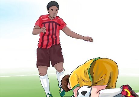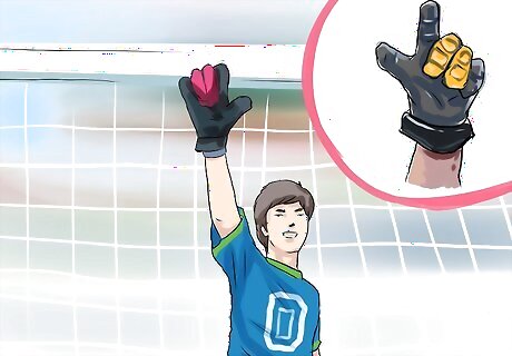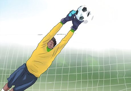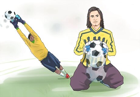 Save shots on goal using your hands and feet. There are different ways to defend the goal area from catching the ball to kicking it or punching it out over the net. Choosing which defense strategy you use will depend on how the ball is approaching the goal area. Catch the ball when you can. This will give you the option to punt it towards your teammates, giving them a chance at a goal. When you catch a ball to save it from going in the goal, you have two options of how to play it: you can either throw it back to your teammates with your hands or directly kick it to one of your teammates further down the field. There are times when it is not practical to catch the ball, for example if it is kicked too high or too fast. In these cases, you can deflect the ball with the palm of your hand or the tips of your fingers, or you can punch it over the net. Kick the ball without first catching it only in an emergency situation, such as an immediate threat to the goal area. If a ball is low to the ground or approaching you at a flat angle, dive for it and then get up quickly. Get up quickly if you dive, catch or kick a ball. You never know when you'll need to make a second save.