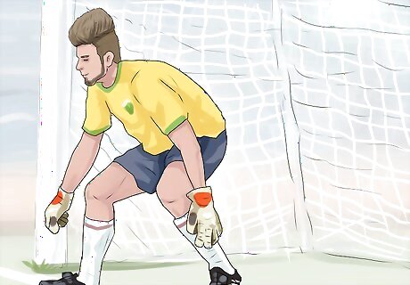 Understand how geometric principles can enhance your technique. Part of being a goalie is anticipating shots on goal, which can come at different speeds and angles. Having a basic understanding that geometric and mathematical principles dictate where a ball will land can help you to more effectively anticipate plays. Always try to close angles so that an opposing player does not have many options from where they can shoot. For example, if the player is charging from the right, don't stand in the middle of the goal. Instead, face the ball with your body and stand close to the right post. A good rule of thumb for positioning yourself properly to angles is to pretend that there is a string extending from the ball to the very center of the goal. You want to position yourself on that string. If a ball is kicked flat to the ground directly towards you, don't just reach your hands downward. Rather, hold your entire body low to the ground, which will allow you to dive forward if necessary. If an opposing player is making a penalty shot, you also need to block the angle. Looking for cues in a player’s eyes or at his feet could help you figure out which angle to block.