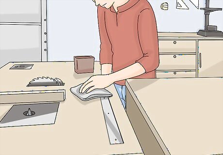 Clean your workspace to avoid clutter and distraction. Whenever you’re finished using a tool or completing a project, take time to clear off the work surface and put the items away. Wipe the surface with a cleaning wipe or a shop cloth to remove any dust or chemicals. If there’s sawdust or debris on the floor, make sure to sweep it up so you don’t slip and fall. Don’t start on the next steps of your project until you’ve cleaned up everything you used. Look for pegboard or toolbox organizers at your local hardware store so your tools are easy to find later on.