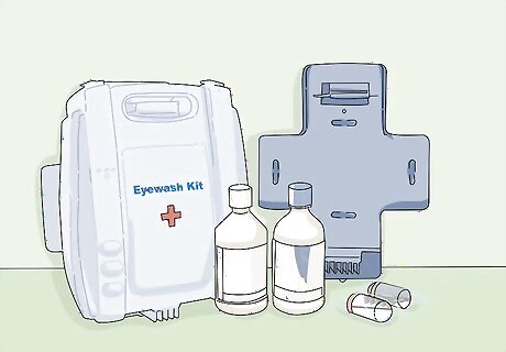 Keep an emergency eyewash kit in case chemicals splash. Eyewash kits use sterile water to rinse out any chemicals that may have gotten in your eyes. Look for portable eyewash bottles at your local hardware store, and place them in your workshop near your main work area. If you ever splash chemicals in your eye, open the bottle of eyewash and hold it directly against your open eye. Squeeze the bottle to clean out the chemicals as quickly as possible. Avoid using tap water to rinse chemicals out of your eyes since they could cause damage to your vision.