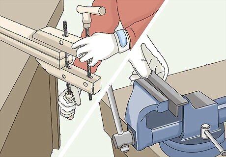 Secure the material you’re working on with a clamp or vise. Set any piece you’re working on to a sturdy work surface so it doesn’t move or shift around. Open the jaws of a clamp or vise and secure them around the material. Tighten the clamp or vise as far as possible to ensure it holds the material securely. You can buy clamps and vises from your local hardware store. If you’re working with a large piece, you may need to clamp it in multiple places if it still shifts around.