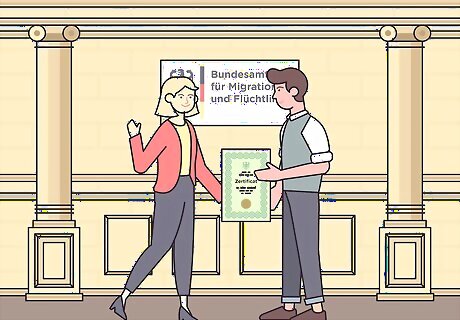 Take a naturalization test. Contact your local Federal Office for Migration and Refugees to register for a naturalization test. This test will contain 33 questions about the history, culture, laws, and civic duties of Germany. You will have 60 minutes to take the test. You must answer 17 questions correctly. If you fail the test, you may take it again. The test is completely in German. As of January 2018, it will cost €25 to take. There is a practice test online in German here: https://oet.bamf.de/ords/oetut/f?p=514:1:0 If you have a degree from a German university or if you are under the age of 16, you do not have to take this test.