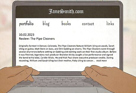 Build your portfolio. As soon as you’ve begun writing clips, compile them into a portfolio that you can show off to interested parties. Having samples of your work collected in one place makes it easy for prospective employers to assess your style and determine whether you would be a good fit for their publication. Choose your strongest work to go into your portfolio. Once you start applying for work, you can send in selections to go along with your work experience. Start a blog. The majority of music journalism is conducted via the internet these days. A well-designed, popular blog with a memorable title that’s full of good writing will serve as a commending portfolio itself. It’s fine if most of your writing is published online, but having physical copies of your work that you can hand out is a definite advantage.