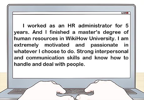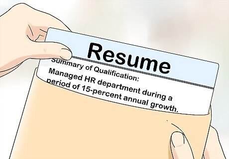 Put together a resume. Include any degrees you've received, and list all of your experience in HR. Mention specific achievements you've accomplished and use hard numbers to quantify them whenever you can. Use simple, concise copy so your resume is easy to read. For example, one of the bullet points on your resume could be "Managed HR department during a period of 15-percent annual growth."