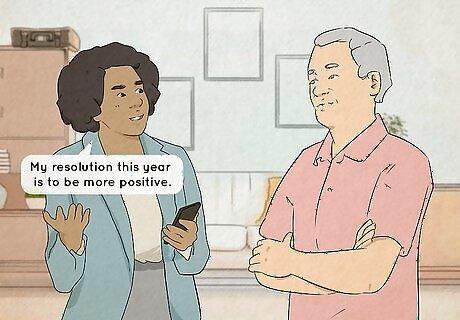 Put a positive spin on things. Maybe you have a family member who is exceedingly negative. Some people seem to just bring down everyone around them. It's normal to not like this type of person. The best way to deal with a downer is to find something positive to say. Make sure to phrase your questions very carefully. Don't give the opportunity to go off on a complaining rant. Instead of saying, "How's your fitness plan going?", try saying, "What is your favorite part of getting in shape?" Don't offer your own complaints. Try saying, "My resolution this year is to be more positive. So I'm trying to only say nice things!"