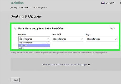 Add a seat reservation if necessary. The system should alert you if you need to buy a seat reservation for the trip you have selected. Seat reservations usually cost extra, so find out if the train requires, recommends, or doesn't allow seat reservations. In some cases you can specify a preference for a window or aisle seat, or even pick your exact seat.