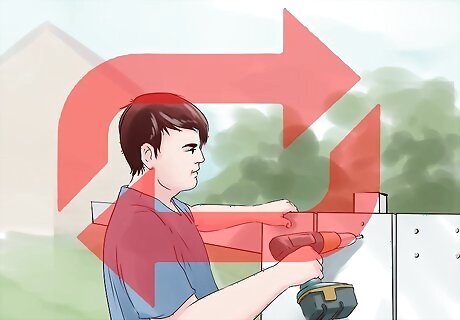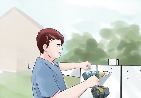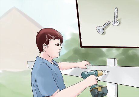 Screw on the steel panels. Ensure that they are plumb and level or sloping uniformly to match the existing grade. Some types of metal panel fencing is designed to overlap, while other panels are installed with spacers, and yet another type has narrow vertical panels staggered on opposite side of the rails.