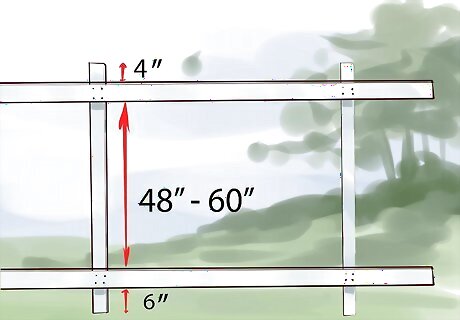 Space your rails according to the fence manufacturer's recommendations. For an ordinary fence 48" to 60" tall, a bottom rail 6 inches (15.2 cm) from the panel bottom and a top rail 4 inches (10.2 cm) from the panel top is sufficient. For taller fences, an intermediate rail is needed, centered between the top and bottom rails.