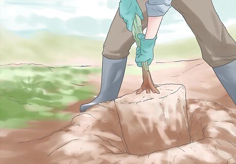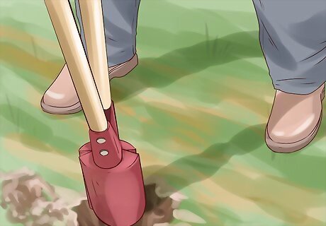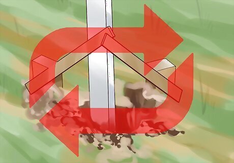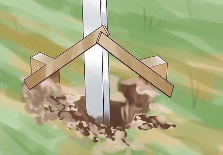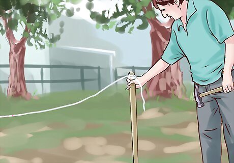 Dig the holes for the fence posts. Use a post hole digger, auger or a double ended shovel. Depending on the soil type, you may have to dig the hole shallower or deeper. A good rule of thumb is to dig each hole 600mm (two feet) deep.