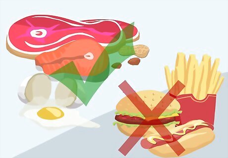 Eat the right foods. The amount of calories you receive is important, but what form they arrive in also makes a difference. Choose lean meats, fresh fruits and vegetables and whole grains over french fries and milkshakes. Not only do wholesome foods contain more vital nutrients, they’re also generally lower in calories, which means you can eat as often as you need to without having to worry about going hungry. Feasting on candy, fried food and other junk can cause you to exceed your ideal calorie threshold fast. Since these foods are so dense with calories, you can easily eat way too much of them before you feel satisfied.