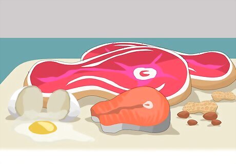 Load up on protein. Your diet should contain an ample amount of protein from lean, natural sources. Some foods that are high in protein include lean cuts of meat, fish, eggs, nuts, legumes, tofu and dairy products like milk and yogurt. The body takes whole proteins and breaks them down into amino acids, which are then used to construct new muscle tissue. Try to get somewhere around 1 gram of protein for every 2 pounds of your body weight (if you’re 160lbs, for example, that’s roughly 70-80g per day). Think of protein as the payment your muscles receive in return for all the work they perform.