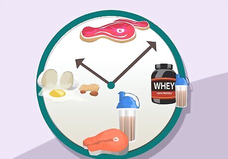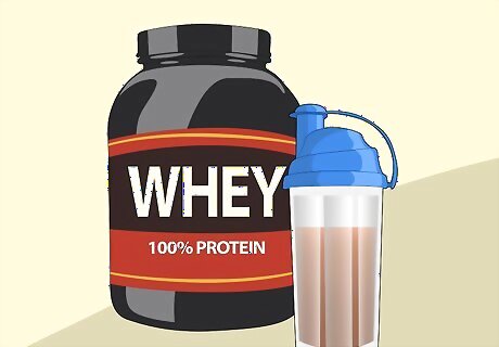 Take a protein supplement. In addition to the protein you get from food, consider using protein shakes, bars or other supplements to increase the total amount you receive each day. It can sometimes be difficult to hit the numbers you need to grow, especially if you’re not all that hungry. A fast-absorbing whey protein shake will offer an extra 25-40 grams per serving, giving you a decisive edge when it comes to piling on size. Having a shake during or immediately after a workout provides much-needed protein to feed and replenish your muscles. Protein supplements can also work as meal replacement options when you’re in a pinch. Have a protein bar before you go to bed or during times when you know you won't be able to eat for a while to keep your muscles stocked with a steady supply of amino acids.