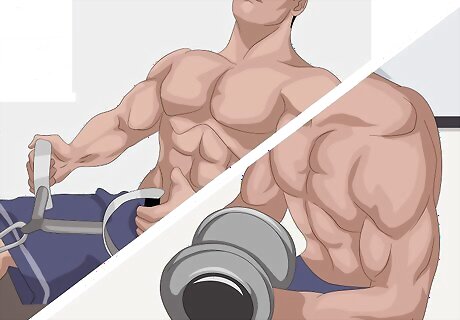 Perform both strength and hypertrophy work. There’s a lot of debate about whether it’s better to focus on strength or volume (the total amount of work you do) in order to build muscle, but in reality you need both. Build your strength levels by performing 3-4 sets of heavy compound lifts (bench press, weighted dips/pull up and row variations will all do the job), then switch your focus in the latter part of the workout to doing multiple sets of higher reps for your accessory work. Though training methods differ slightly, there is a close relationship between strength and size. Being able to lift more weight means you can lift heavier weights more times, driving up your total volume and, in turn, your mass-gaining potential.