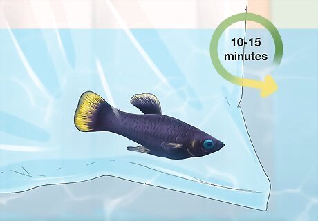 Transfer from the bag to your tank. When you transfer your fish make sure to float the bag in the tank for at least 10 to 15 minutes. This will allow your fish to get accustomed to the new water temperature and environment. Then, open the bag at the top and gently scoop the fish out and into the tank water. Dispose of the bag. Try to avoid letting any of the bag water into the tank. The bag could contain infections from the store that you do not want loose in your tank.