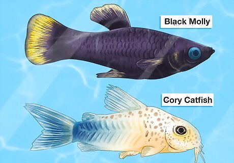 Look for inexpensive breeds of fish. Get a fish that can be replaced rather easily and cheaply, just in case something goes wrong. Saltwater fish are more expensive and require much more equipment than freshwater. In contrast, a corydora catfish is readily available and won't break the bank. Tetras, Cory Cats, and Black Mollies are inexpensive options as well. You can also compare prices to find the best deal.