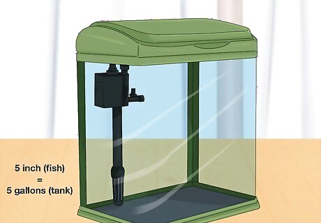 Consider your tank size. You will want to follow the “inch-per-gallon” rule when deciding on an aquarium size. This means that for every inch of fish in your tank, you will need a full gallon of water. So, a five-inch fish requires at least a five-gallon tank. Keep in mind that if you get a school of fish, you will need even more room. Not every fish should go in a tank just by using the inch-per-gallon rule. It is a good idea to get a tank that is at least 20 gallons. This is a manageable size for a beginner fish-keeper. This also means that the tiny bowls sold in fish stores are too small to ensure the long-term health of your fish. The inch a gallon rule is general. Keep in mind some fish (like goldfish) create a lot of waste, or need more space.