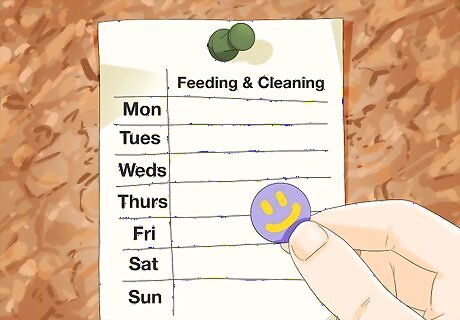 Create a fish-chore schedule. This can be a simple chart that shows feedings and cleanings by the week. As your child completes each task, give them a sticker to place on top of the completed chore on the chart. This will keep them engaged in the upkeep and care of the fish, while making fish-related chores fun as well.