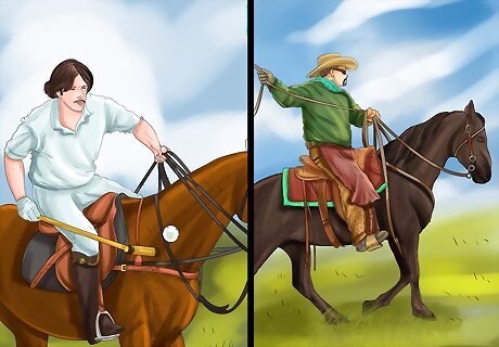 Read up on saddle types. English and Western are the two basic kinds of saddle, but there are actually countless variations of the two. English saddles are smaller, lighter, and allow you to be closer to the horse. Western saddles are larger, and they require padding between the horse and saddle. The most noticeable difference between the two is the horn on the Western saddle. English saddles are available in a variety of styles for different uses. For instance, deeper seated saddles are used for dressage, stylized horse riding competition. Western saddles come in many styles, and they are often decorated with artistic flourishes in the leather.