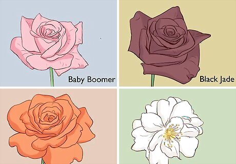 Select a miniature or tea rose variety for smaller flowers. Miniature and tea roses are often easier to care for, smaller overall, and they come in lots of different colors. You can even grow these varieties in a container if you do not want to plant them in your garden. Some popular tea rose varieties include: Baby Boomer Black Jade Carrot Top Dancing Flame Gourmet Popcorn