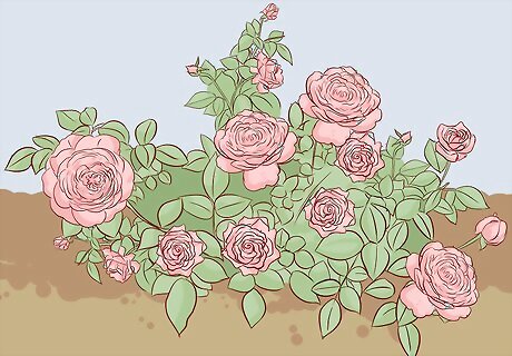 Go with ground cover roses to fill in bare patches with attractive foliage. If you want roses that will fill in bare patches in your garden or that will accent other types of shrubs and flowers, then a ground cover rose bush might be a good choice. These grow no more than 2 ft (0.61 m) off the ground, but they sprawl outward by 3 to 6.5 feet (0.91 to 1.98 m). Ground cover roses come in a wide range of colors, but some popular varieties include: Magic Carpet (bright, lavender-pink flowers) Snow Carpet (white flowers) Raubritter (pink flowers) Max Graf (deep pink flowers) Nozomi (pink flowers)