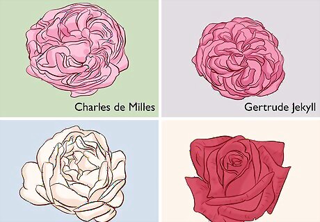 Choose roses with a strong scent if you want to be able to smell them. Not all roses have a noticeable scent, which is fine if you only want to look at them. However, if you want to be able to smell the roses as soon as you walk near them, go with an extra aromatic variety of rose bush. Some highly aromatic roses include: Charles de Milles Double Delight Gertrude Jekyll Jude the Obscure Pap Meilland