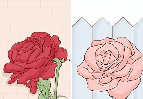 Choose roses in colors that will complement your garden. Opt for a rose bush with flowers that will complement the wall or other features of your property. Stick with warm tones to complement warm colors such as red, brown, orange, and yellow. Go with cool tones to complement cool toned features, such a blue, grey, and lavender. For example, you can go with red, yellow, peach, or orange roses if you want to grow them up against a brick house or a house that is painted red, brown, or yellow. Try lavender, white, or pink roses if you want to grow them near a grey or blue house or fence.Tip: Although it is not common, there are some roses that feature blue and green flowers. Check an online supplier if you want roses in an unusual color.