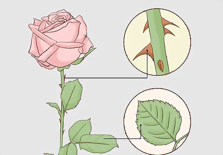 Look into roses with ornamental stems, leaves, and thorns. If you want something exotic, try selecting a rose bush that will develop some unique foliage. You can find varieties with ornate leaves, thorns, stems, and other interesting features beyond the flowers. For example, you can find rose bush varieties with glossy leaves, like Cooperi and Lutea. Choose rosebushes with fern-like foliage, such as Multibracteata and Primula. Opt for extra thorny stems, like Canary Bird and Primula. Select bushes with leaves that change from green to a rich crimson in the fall like Nitida.