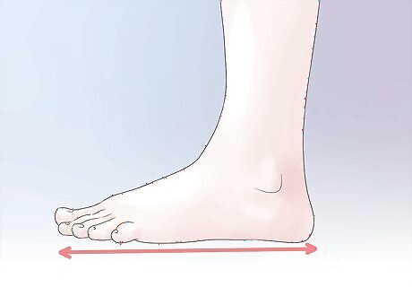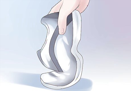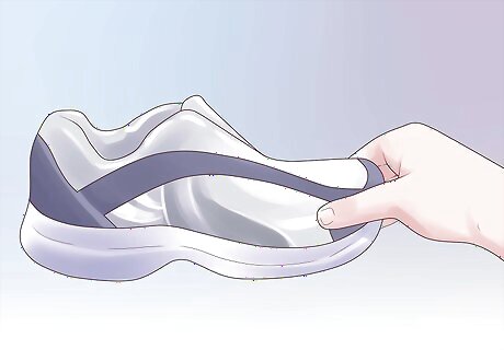 Check the flex point of the shoes. The flex point of the shoe is the point at which it bends while running. For optimal comfort, the flex point of the shoe should match the bending point of your foot. You can check the flex point of the shoe by holding it by the heel and pressing the toe of the shoe onto the ground. The point where the shoe bends and creases (if it bends at all) is the flex point. This step is important, because if the flex point of the shoe doesn't align with your foot it can cause problems like arch pain or plantar fasciitis (heel pain).
