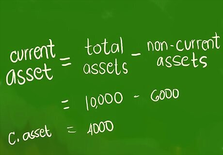 Calculate current assets. In order to calculate a current ratio, you’ll first need to find the company’s current assets. To do so, subtract non-current assets from the company’s total assets. To illustrate, let’s say you are calculating the current ratio of a company with $120,000 in total assets, $55,000 in equity, $28,000 in non-current assets, and $26,000 in non-current liabilities. To calculate current assets, subtract non-current assets from total assets: $120,000 - $28,000 = $92,000.