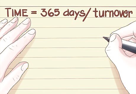 Use the formula Time = 365 days/turnover to find the average time to sell your inventory. With one extra operation, you can find how long it takes you on average to sell your entire stock of inventory. First, find your yearly inventory turnover as normal. Then, divide 365 days by the ratio you got for inventory turnover. Your answer will be the number of days that it takes you to sell your entire inventory on average. For instance, let's say that we have an inventory turnover ratio of 8.5 for a given year. By dividing 365 days/8.5, we get 42.9 days. In other words, on average, we sell an entire stock of inventory about every 43 days. If you found your inventory turnover for a period of time other than a year, substitute the number of days in your time period for 365 days in the formula. For instance, if you had an inventory turnover of 2.5 for the month of September, you would find your average time to sell your inventory by dividing 30 days/2.5 = 12 days.