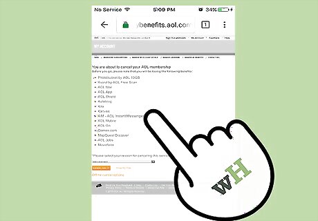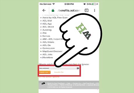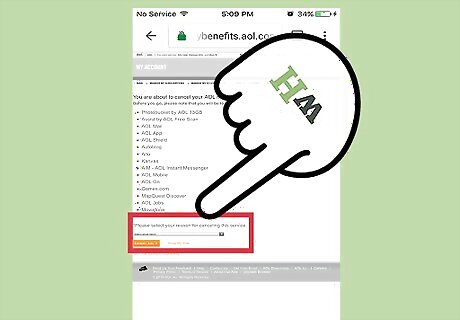 Tap the select a reason for canceling drop-down. Tap the drop-down menu beneath the prompt asking you to select a reason for canceling your AOL subscription. The prompt and drop-down are located at the bottom left of the screen, just above the orange "Cancel AOL" button.